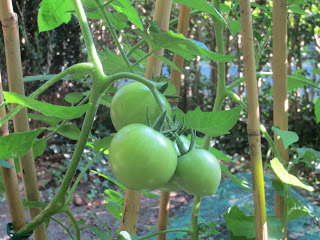slotstuk van de moestuin: drie tomatenplanten. De oogst bestaat tot nu toe uit