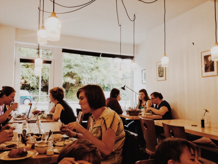 In een gezelschap van zeven – onder wie drie uitgehongerde kinderen – voegde ik vorige zondag de daad bij het woord. Voor alle zekerheid had ik de dag voordien toch maar gereserveerd, want de zaak is niet zo groot. Om 12 uur zat het er inderdaad behoorlijk vol en – hoewel het buiten eerder herfst dan lente leek – was het binnen broeierig warm. (Hopen dat er tegen de zomer toch ergens een raampje open kan.) De inrichting is eenvoudig maar gezellig, met veel hout en kunst aan de muur.