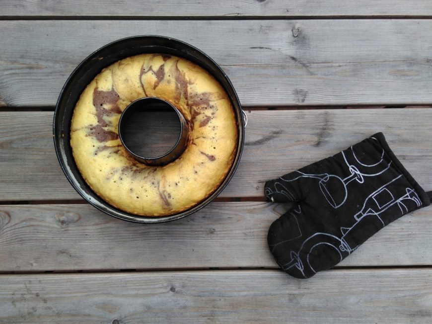 Meng de boter met de suiker en de eierdooiers tot een lichte, homogene massa. Voeg geleidelijk de gezeefde bloem toe en meng er daarna voorzichtig het stijfgeklopte eiwit onder. Giet tweederde van de cake in de bakvorm. Voeg bij het resterende derde deel twee lepels cacao of een reep gesmolten chocolade. Giet de chocoladedeeg boven de witte deeg in de vorm en meng lichtjes met een vork. Bak ongeveer 45 minuten in een voorverwarmde oven op 150-170 graden.