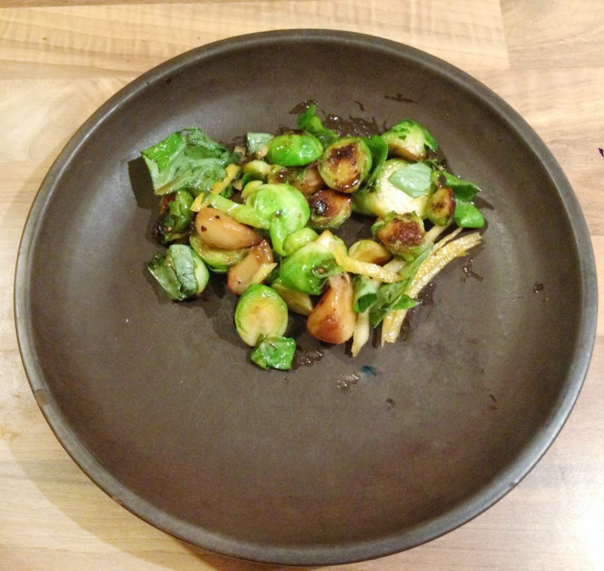 - Meng de gebakken spruitjes met de chilipeper, de citroenschil, het knoflookmengsel en de fijngesneden basilicumblaadjes, en dien op.