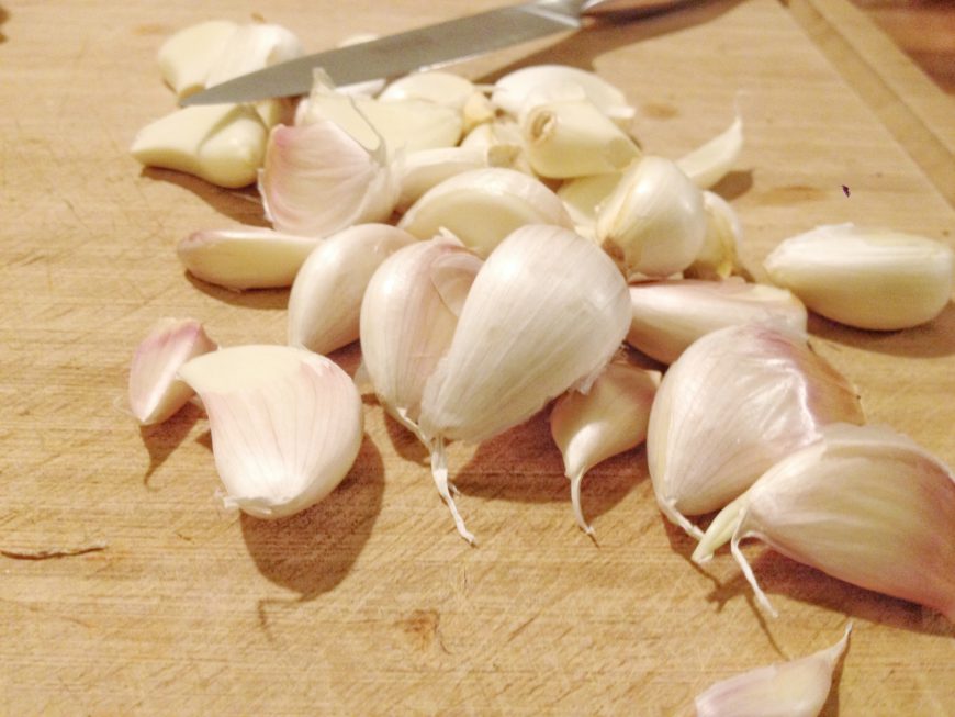 - De gepelde knoflookteentjes blancheer je eerst 3 minuten in kokend water. Dan giet je ze af en bak je ze even met wat olijfolie in een wok of een pan.