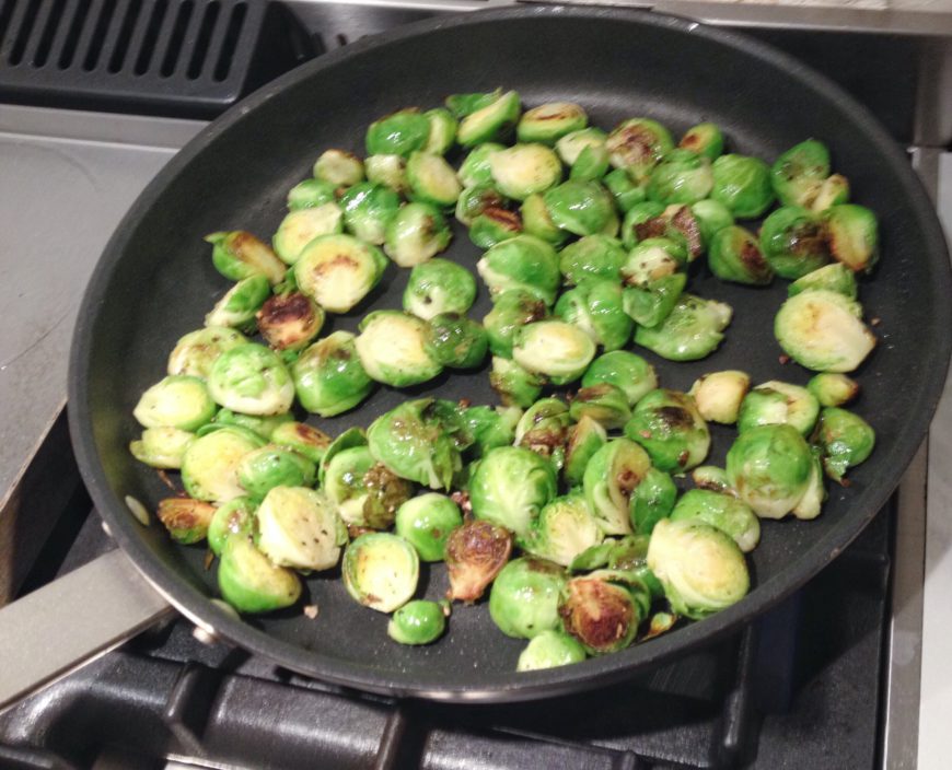 - Maak de spruitjes schoon, snijd ze doormidden, bak ze met olijfolie in een pan op een hoog vuur tot ze bruin zijn. Kruid met wat peper.